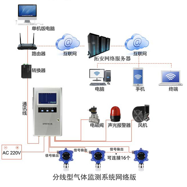 分線一般傳輸?shù)氖悄M信號,我們一般采用二線制4-20mA信號或三線制4-20mA信號;一般4mA對應(yīng)量程的底限,而20mA則對應(yīng)量程的高限。分線主要應(yīng)用在探測器數(shù)量少,分布不集中,離控制室較近且系統(tǒng)安全要求較高的場合。其優(yōu)點是系統(tǒng)安全可靠;行業(yè)內(nèi)控制器互換性高;缺點是探測器和控制器間不可傳輸命令,不夠智能化;布線不方便。